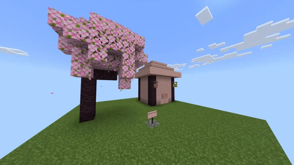 - Стройте все, что хотите: Вы можете построить все, что хотите, в Minecraft 1.21 One Block Map. Разные типы домов, ферм, баз можно построить. Красивые дома можно построить рядом с вишневыми цветами, которые предлагают красивые виды.