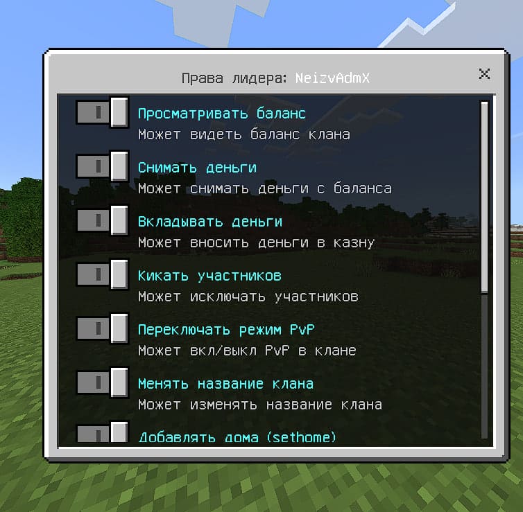 /clan pvp — Включить/выключить PvP внутри клана (лидер)